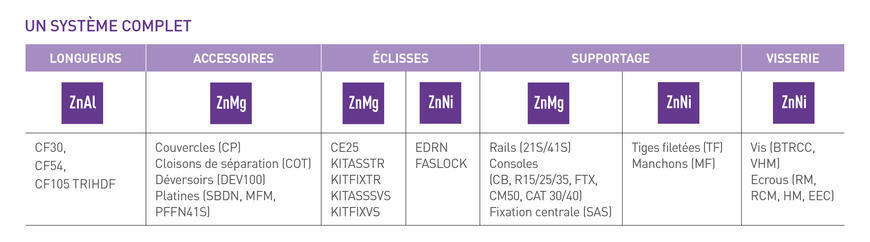 En plus des chemins de câbles filaires en zinc aluminium (ZnAl), la gamme est complétée par divers accessoires et raccords réalisés dans des matières durables similaires comme le zinc magnésium (ZnMg) et le zinc nickel (ZnNi).